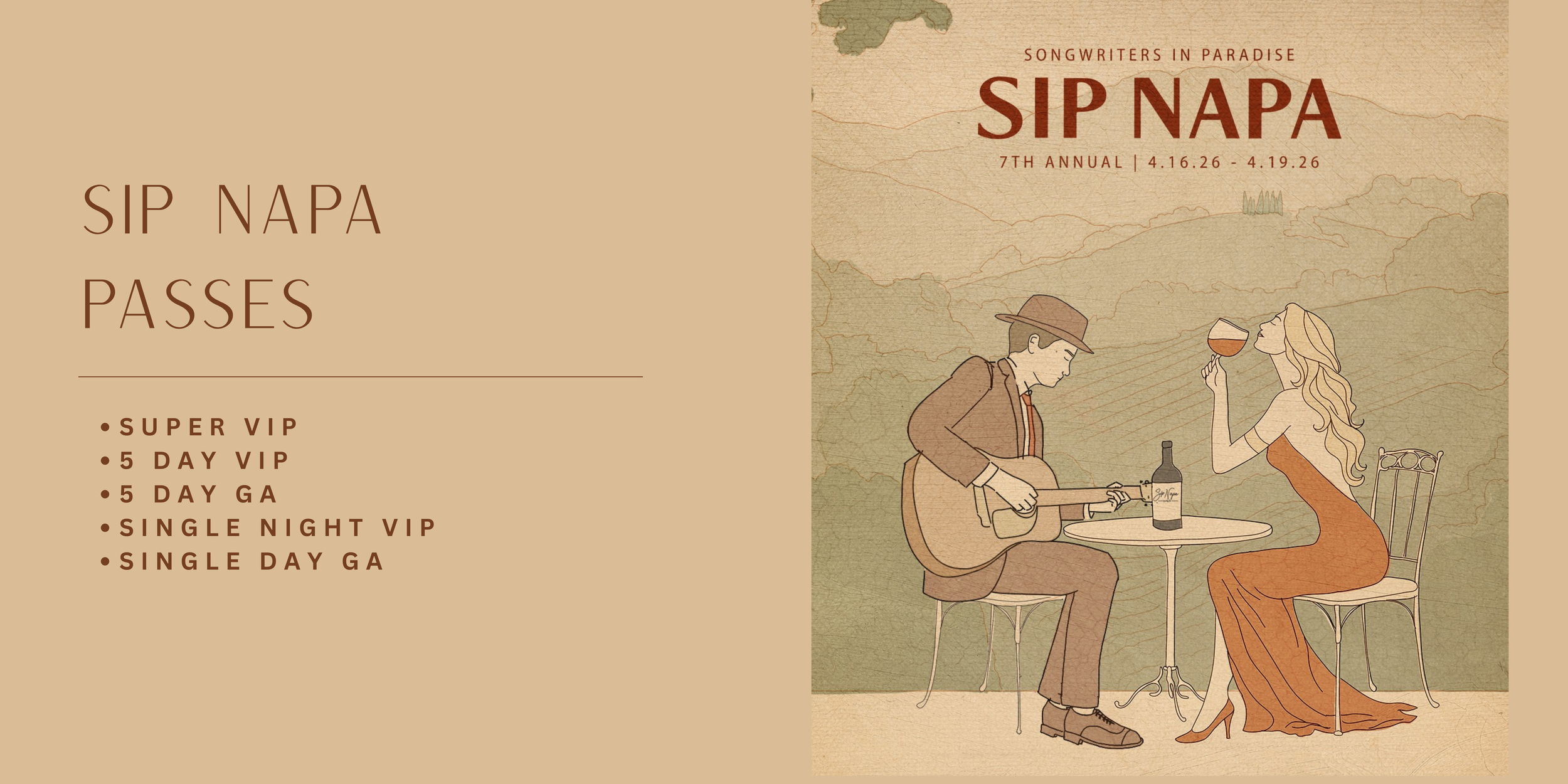 Entry to chosen intimate showVIP SINGLE DAY PASS SEATING AT THE SHOWSINGLE DAY VIP PASS SWAG BAGCOMPLIMENTARY VIP WINE BAR WITH ELEVATED WINE SELECTION AT THE SHOWShuttle service from Harvest Inn to the eventDownloadable photos from the eventSIP NAPA 2026 commemorative pass & lanyard